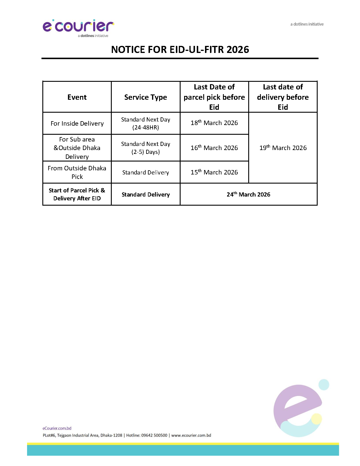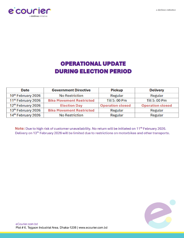 eCourier is Bangladesh’s most trusted on-demand last mile logistics network offering tech-enabled one stop delivery solutions. Since its inception in 2014, our vision has been to become the operating system for e-commerce in Bangladesh, through a combination of world-class infrastructure, logistics operations of the highest quality and cutting-edge technology capabilities.